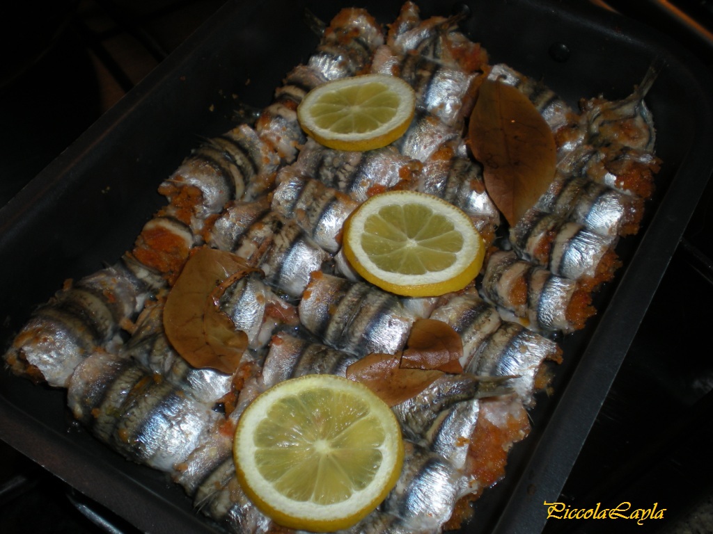 Disponete su un tagliare le alici, con la punta delle dita prelevate un po’ di composto e disponetelo dal lato della testa, lasciando la parte argentata verso l esterno, avvolgete delicatamente e disponete in una teglia d forno unta posizionando le code sulla base della teglia, continuate fino ad esaurimento degli ingredienti.Decorare con rondelle di limone e le foglie di alloro, versare il vino e cuocere per 5 minuti a grill medio. Servire caldi con una fettina di limone e un po’ di succo.