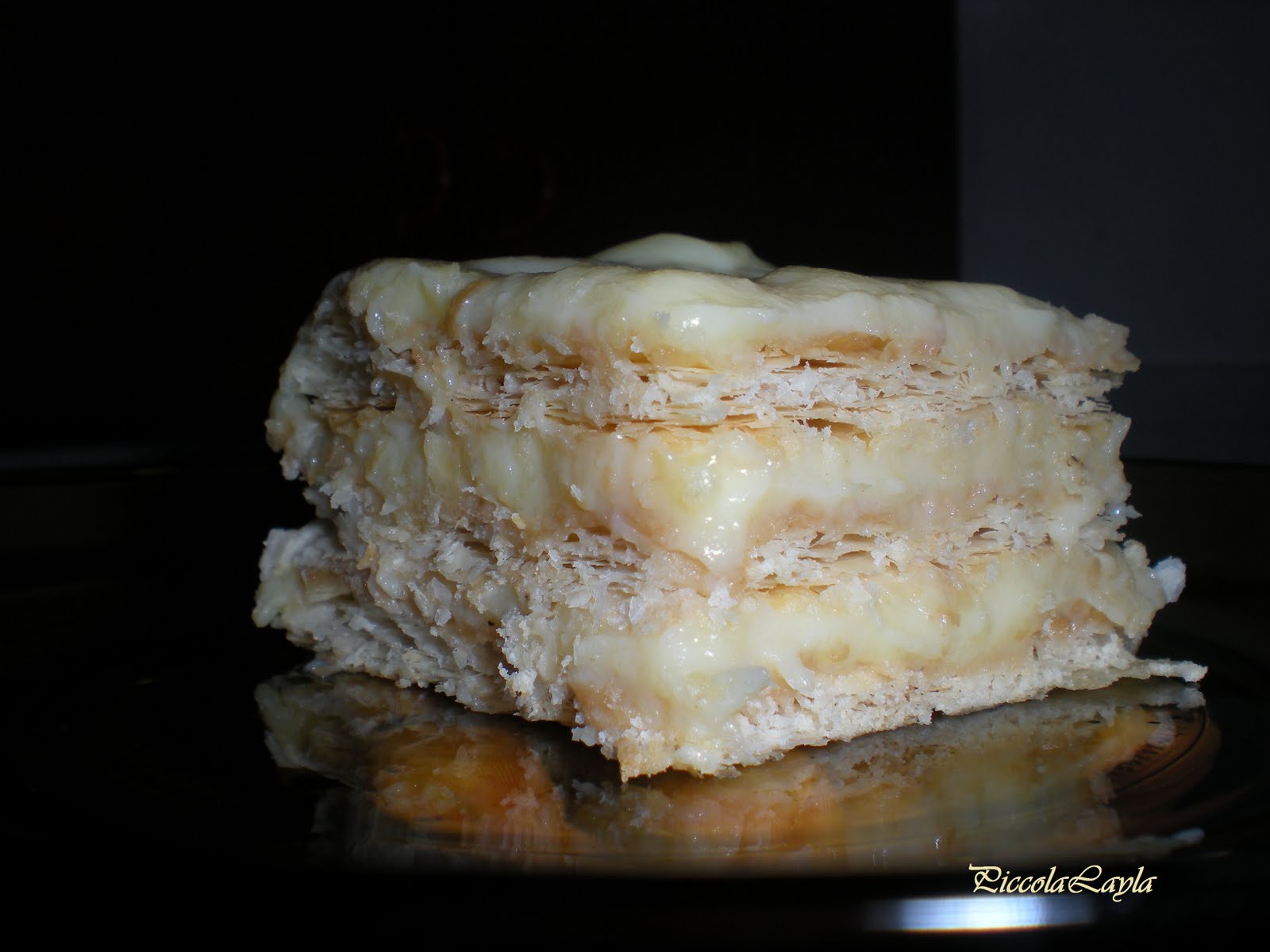 In un piatto da portata o su un vassoio con le sponde non troppo alte disporre un primo strato di pasta sfoglia, un secondo strato di crema abbastanza spesso, un altro strato di pasta sfoglia, crema e concludere con la sfoglia. Lasciare riposare in frigo un 1h prima di servire
