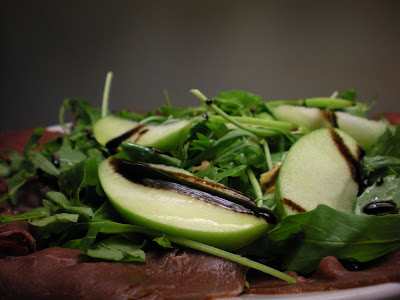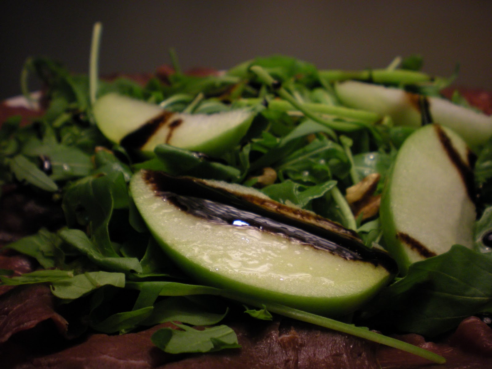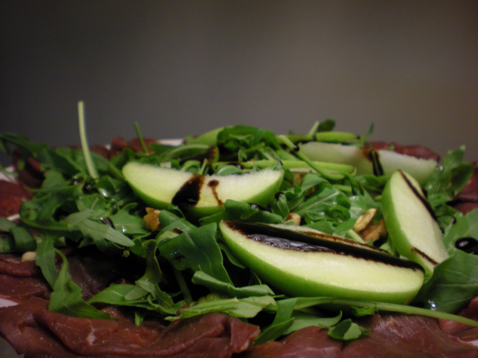 Disporre su un piatto da portata il carpaccio, spremere il succo di limone sulla carne e lasciare che questo insaporisca per qualche minuto, scolare il liquido in eccesso e decorare con la rucola, salare, disporre le mele e i gherigli di noci condire con l’aceto balsamico e l’olio evo.