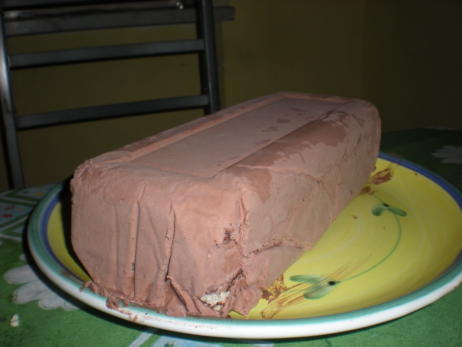 Una volta solidificato occorrerà capolgerlo su un piatto da portata, possibilmente rettangolare, staccare delicatamente la carta forno e decorare con i riccioli di panna montata e tutto quello che la fantasia vi suggerisce….lasciare riposare qualche minuto prima di tagliare con un coltello pesante bagnato di acqua fredda.