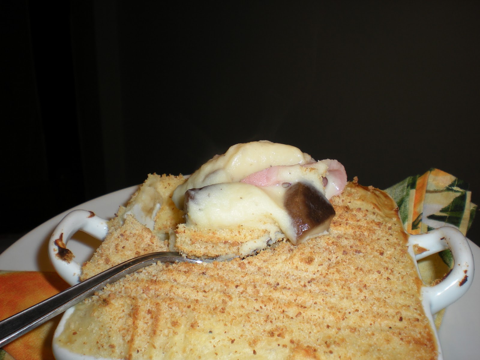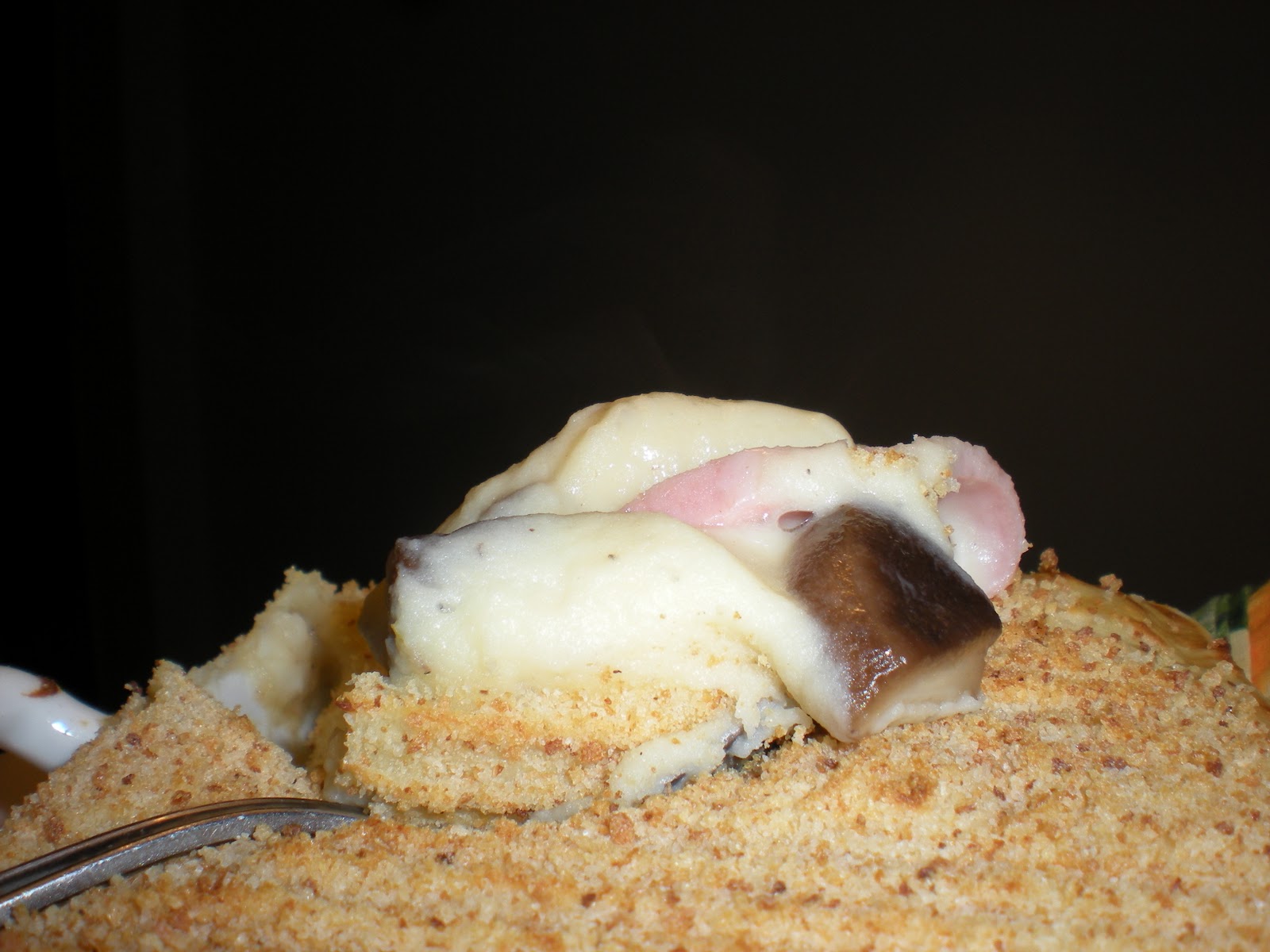 Spalmare lo stampo di burro e cospargerlo di pangrattato, riempire il fondo di purè aggiungere la mortadella, i funghi e il formaggio a fettine, coprire con un secondo strato di purè e cospargere di pangrattato.