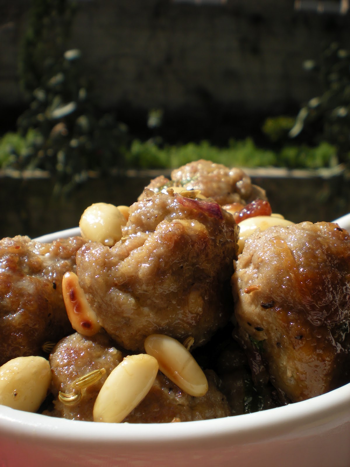 Affettate la cipolla e lasciatela andare in una padella molto capiente con abbondante olio, quando sarà colorita e tenera aggiungete la frutta secca tostata, l’uva passa e i semi di finocchio, lasciare sfregolare per qualche minuto, insaporite con sale e pepe; abbassate la fiamma e aggiungete le polpette, mescolando delicatamente con una spatola di legno o scuotendo la padella, spolverate con lo zucchero e sfumate con l’aceto di vino.