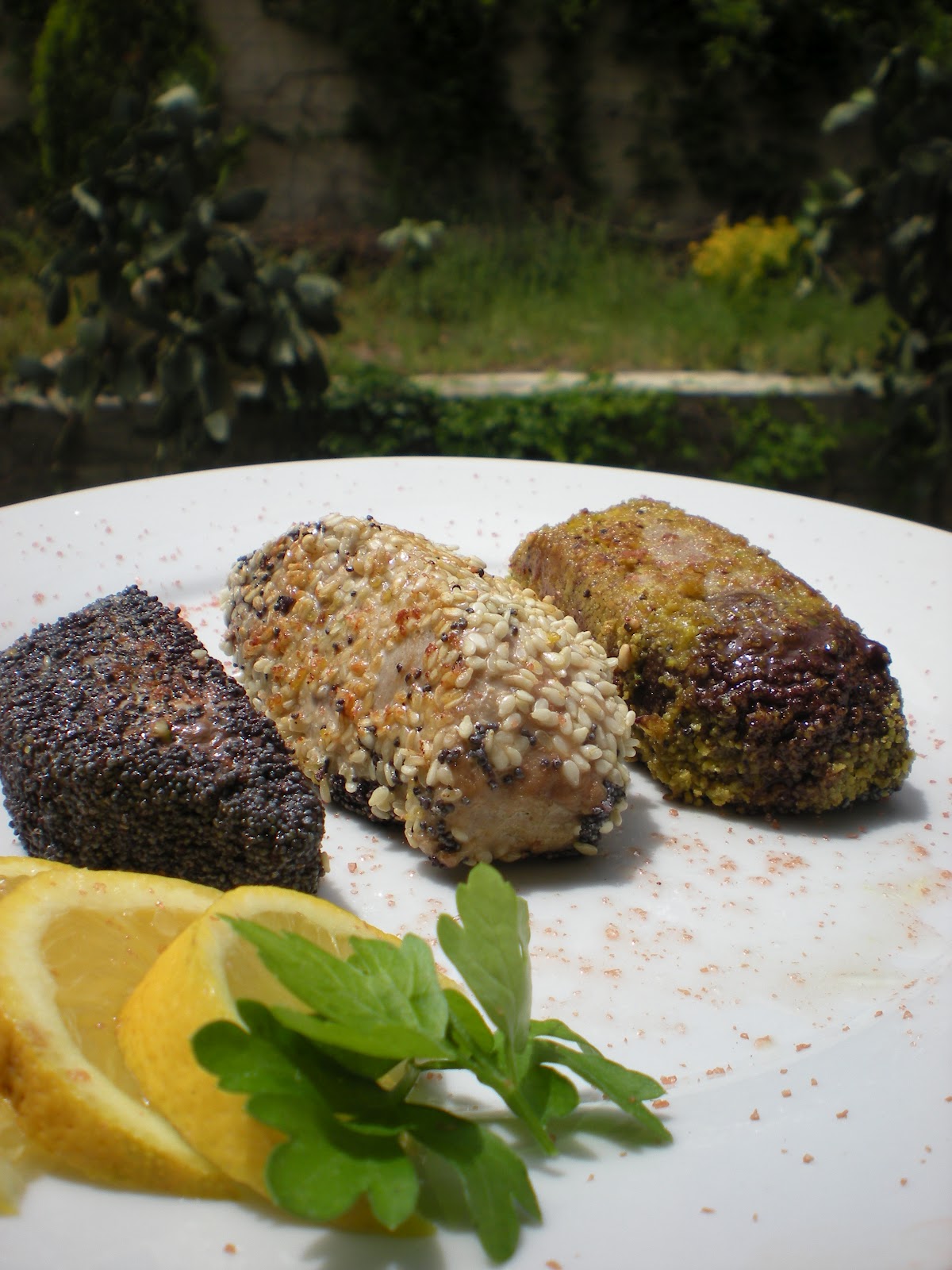 Tagliate il tonno in 12 tranci non troppo piccoli piccoli mantenendo sempre lo spessore. Ungeteli con olio evo e cospargete 4 tranci con i pistacchi, 4 con i semi di sesamo e 4 con i semi di papavero. Riscaldate una griglia liscia e adagiatevi delicatamente i tranci con l’aiuto di una paletta di teflon.